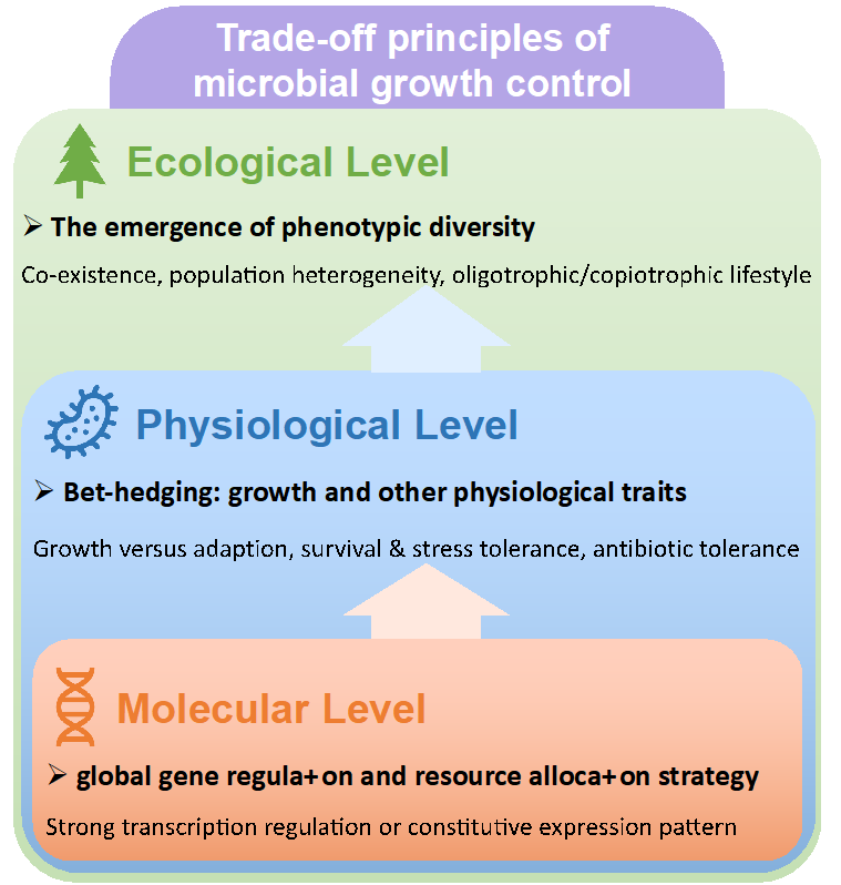 图1:通过生长调控的权衡理论体系将微生物学的三个研究层次进行了有机统一